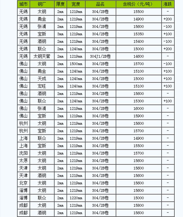 11月13日全國城市304/2B冷軋卷的價格漲跌不一,主流報價在14600-16000元/噸。